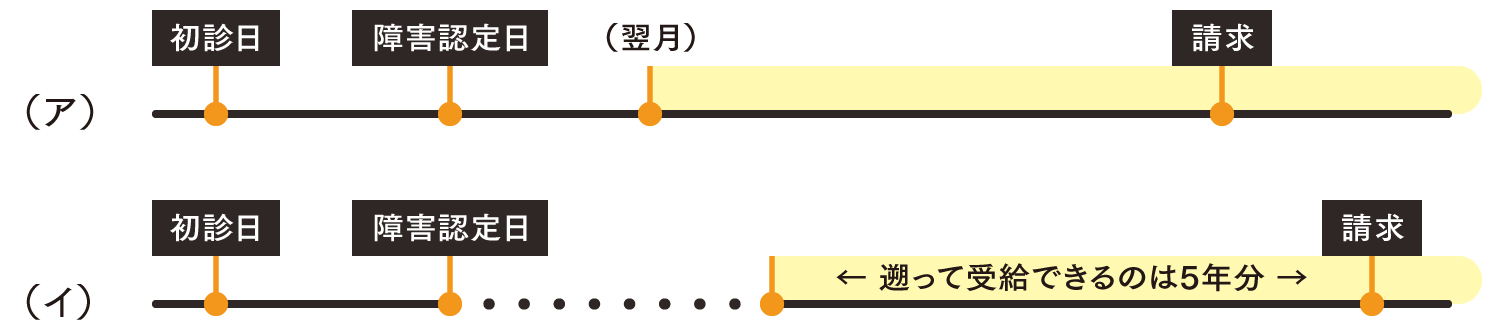 障害認定⽇に法令に定める障害の状態にあるときは、障害認定⽇の翌⽉分から年⾦を受け取ることができます(ア)。